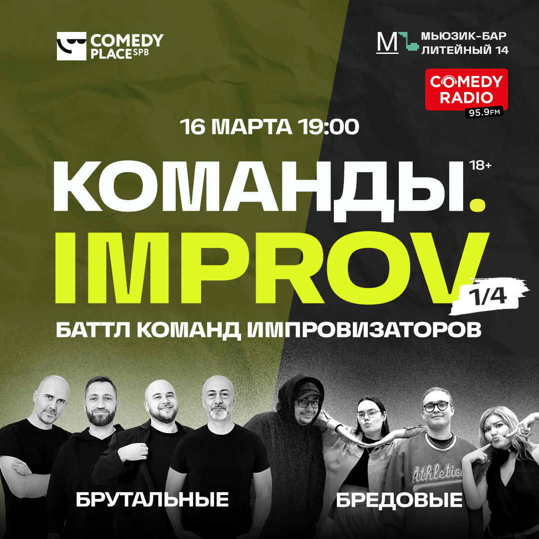 «КОМАНДЫ. IMPROV» - непредсказуемое комедийное шоу, в котором команды из Петербурга сойдутся в импровизационных баттлах за денежный приз.
